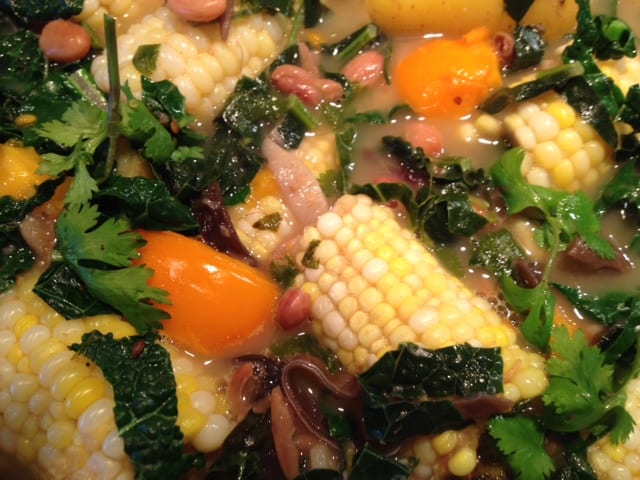 Our local CSA farm called Seeds and Spores Family Farm is loading us up with super sweet corn, late summer tomatoes, winter greens and Shiitake mushrooms. New potatoes are arriving and the onions,shallots and garlic are drying! My Bean and Corn Chowder with Forest Mushrooms transforms this late summer harvest into a warming, satisfying and super nutritious vegetarian supper! Enjoy my Bean and Corn Chowder with Forest Mushrooms with a wholesome rye bread and a glass of Riesling! Just delicious!