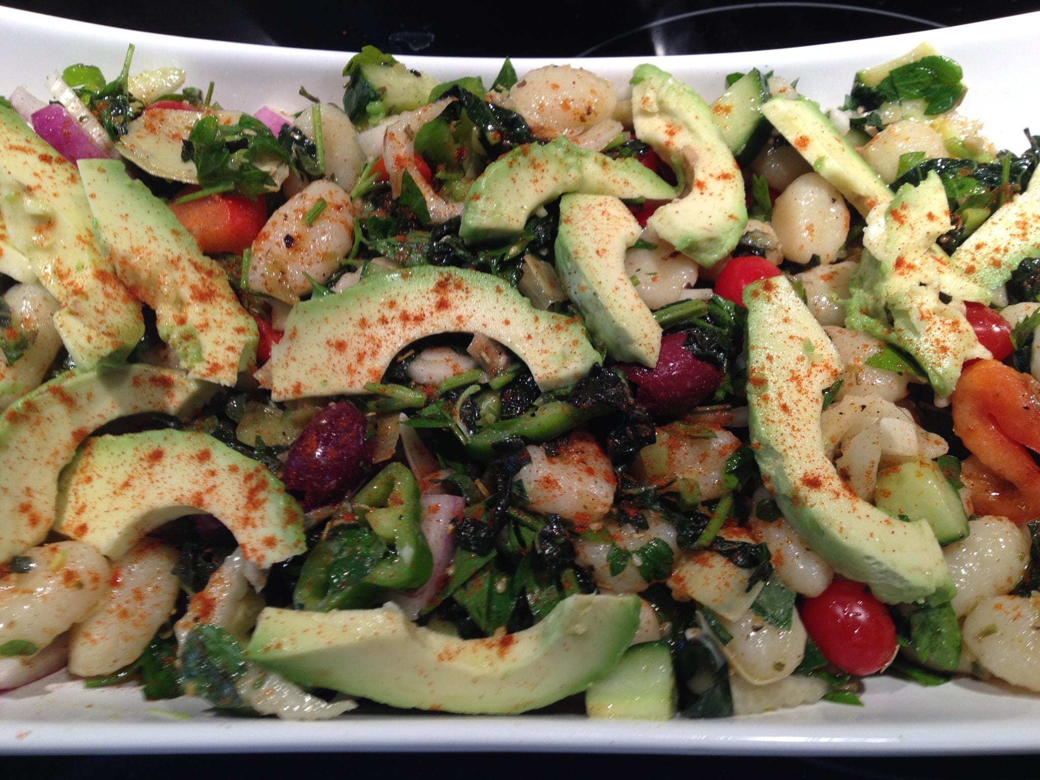 garnished with slices of healthy avocado! My Gnocchi Salad with wilted Kale and Leeks